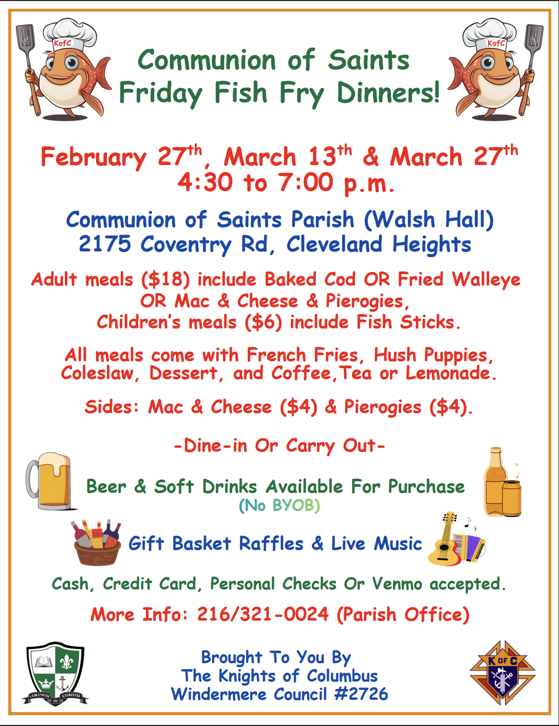 The Communion of Saints Fish Fry is hosted by the Knights of Columbus Windemere Council 2726. We offer three Friday dinners during the Lenten season providing a variety of meatless dishes and an opportunity to spend time with parishioners. Take out orders are available and arrangements for delivery can be made for the home-bound.