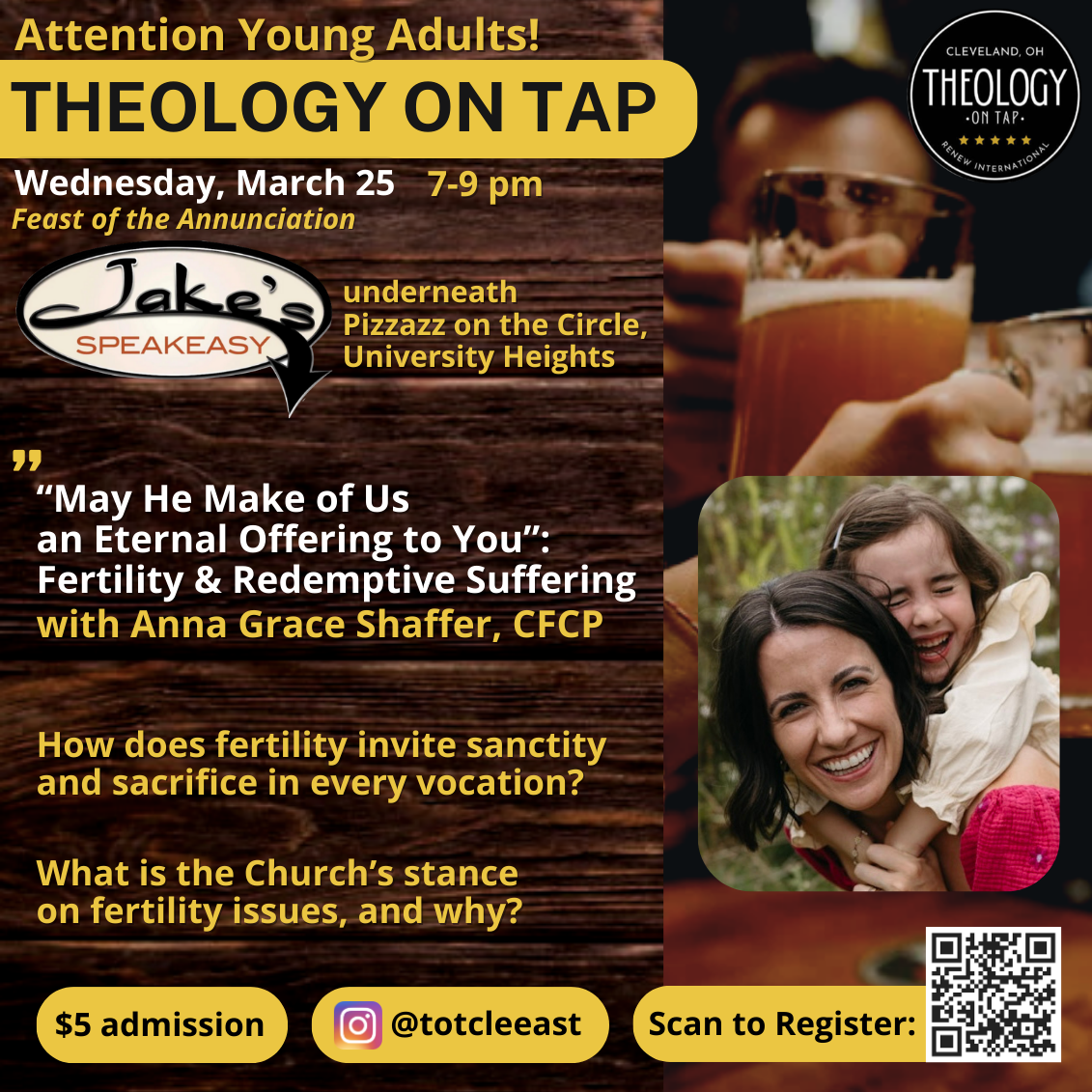 Every FOURTH Wednesday of the month (except November and December due to the holidays, when it will be the third Wednesday), young adults in their 20’s and 30’s are invited to gather at Jake’s Speakeasy underneath Pizzazz on the Circle at 7PM to hear an engaging speaker reflect on some aspect of the faith while enjoying a pint and some tasty food! Each night kicks off with a social, which includes complimentary pizza, wings & salad and a cash bar, followed by a speaker and Q&A. Admission is only $5. Theology on Tap is a great way for young adults, college students, and newly married couples to go deeper in their faith and connect with other young Catholics in the area. For more information, check out their Instagram @totcleeast.